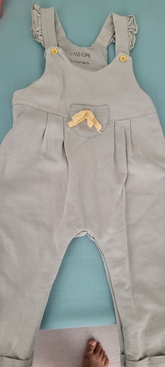 Gri renkte, keten kumaştan, bol kesim ve kolsuz erkek çocuk tulumu. Ön cepte dekoratif fiyonk bulunur, sade ve şık bir tasarım sunar.