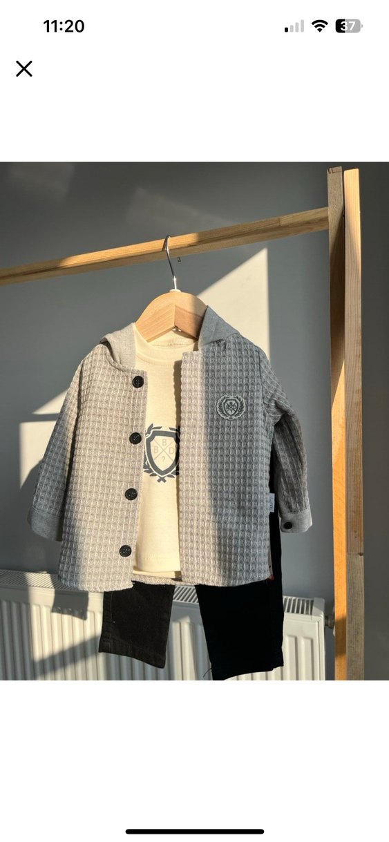 Gri renkte, keten kumaştan yapılmış erkek çocuk ceketi, yakası kesik ve düğmeli kapamalıdır. Rahat kesimiyle trend bir görünüm sunar. 3 lü takım 24 ay uyumlu