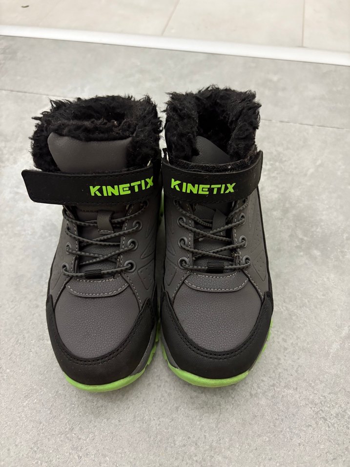 Gri renkli, kauçuk malzemeden yapılmış, baskılı ve Velcro bantlı erkek çocuk botları. "KINETIX" yazılı ve rahat iç astarlı.