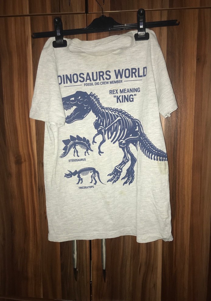 Gri renk, kısa kollu, rahat kesim ve yuvarlak yakalı erkek çocuk tişörtü. Dinazor iskeleti baskısı ve 'DINOSAURSWORLD' yazısı bulunur. Yumuşak ahşap bazlı kumaştan üretilmiştir. Hiçbir kusuru yoktur.etiketi 10-11 yaş