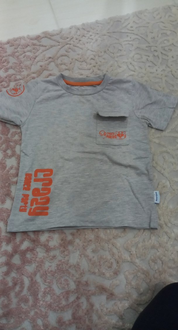 Pamuklu kumaştan üretilmiş, gri renkli, kısa kollu, bisiklet yaka ve bol kesim erkek çocuk tişörtü. Baskılı detaylar ve küçük göğüs cebi bulunur.