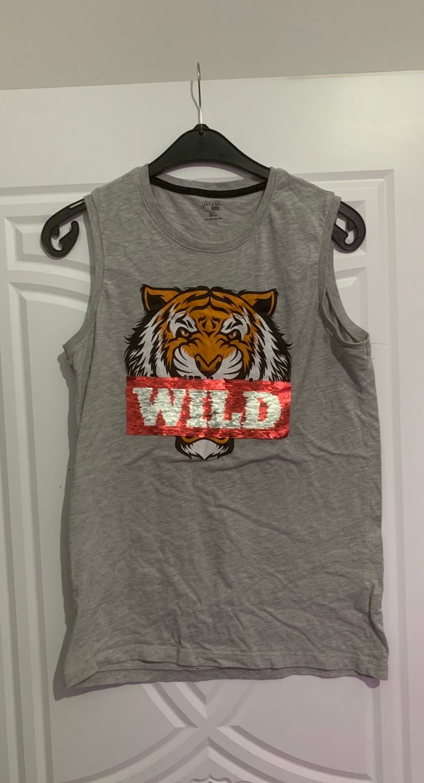 Gri renk, kolsuz, bol kesim erkek çocuk tişörtü. Yuvarlak yaka, baskılı kaplan deseni ve payetli 'WILD' yazısı bulunur. Sentetik kumaştan, renk değiştirebilir pullardan