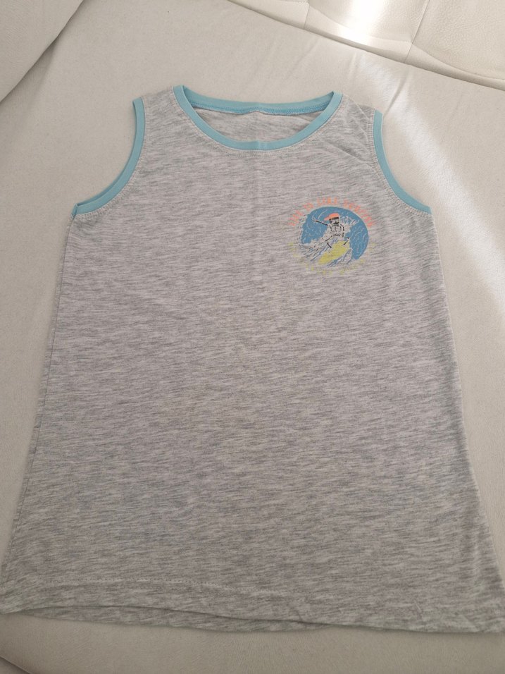 Gri renkte, baskılı detaylı, düğmeli ve kolsuz erkek çocuk yeleği. Rahat kesimi ve yuvarlak yakası ile günlük kullanım için uygundur.