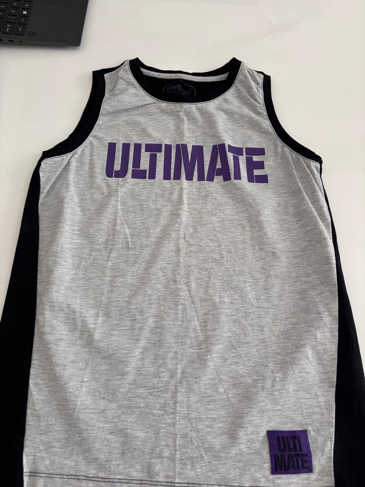 Gri renkli, kolsuz ve fitted kesim erkek çocuk tişörtü. Önünde "ULTIMATE" baskısı bulunan yumuşak sentetik kumaştan üretilmiştir.