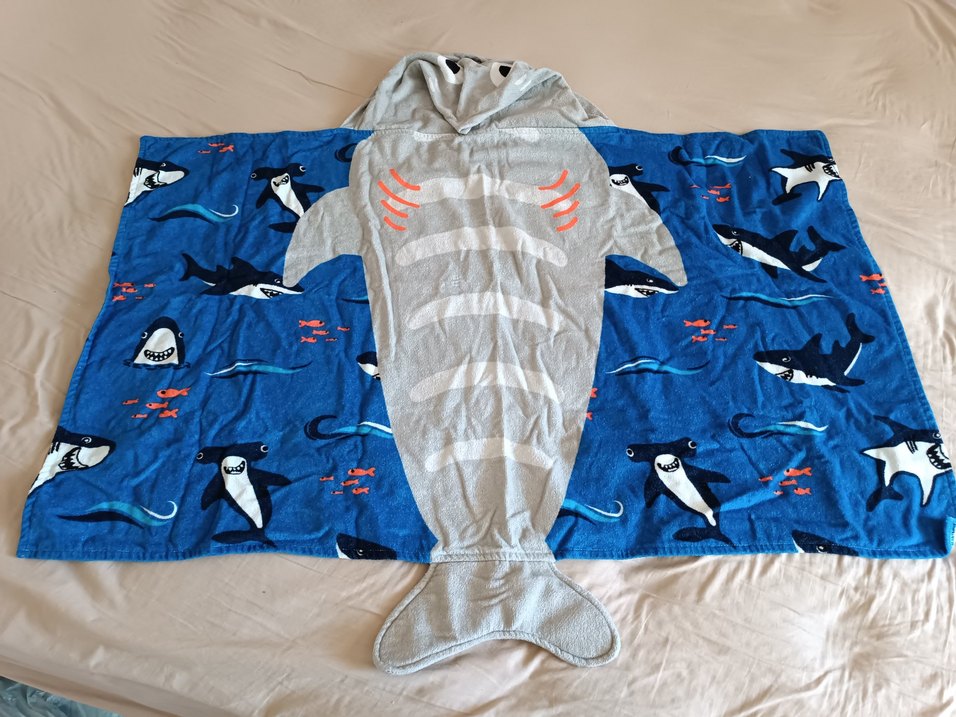 Gri renkli, köpekbalığı şeklinde baskılı erkek çocuk bornozu. Kapüşonlu ve yumuşak kumaştan üretilmiştir. Ölçüleri resimde yer almaktadir