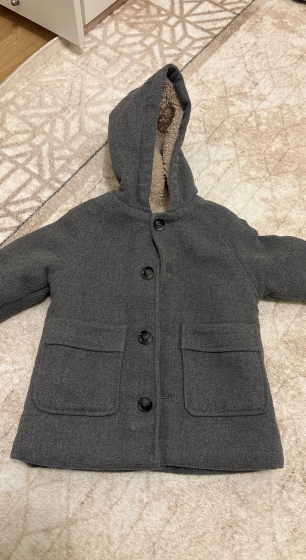 Gri renkli, kürklü kapüşonlu erkek çocuk kabanı. Notch yakalı ve iki ön cepli, yumuşak ve sıcak kumaştan üretilmiştir.