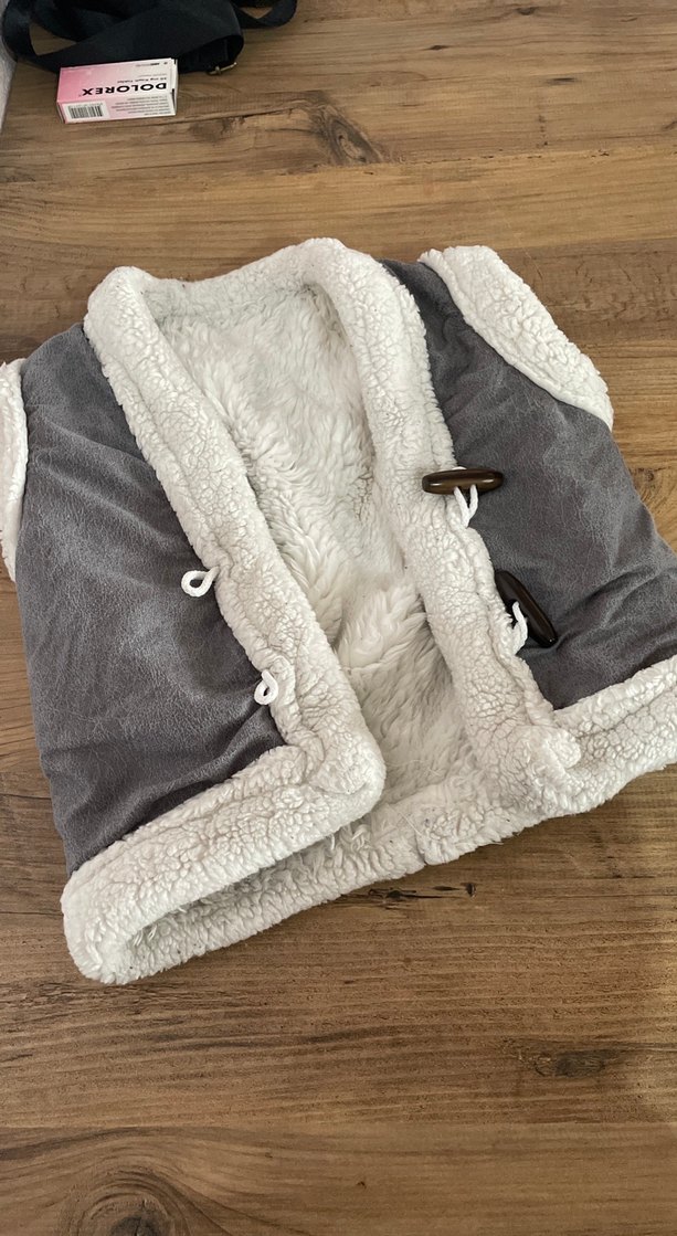 Gri renkte, kürklü detaylı ve bol kesim erkek çocuk yeleği. Kolsuz, çıtçıtlı ve notlu yaka tasarımıyla sade ve rahat.