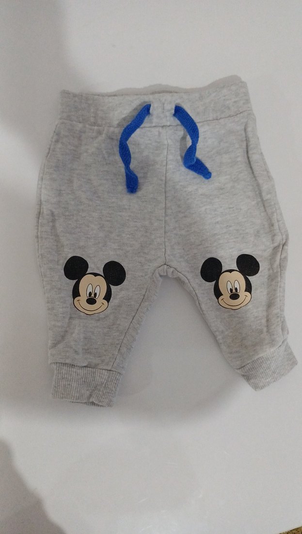 Yumuşak pamuklu kumaştan, mavi bağcık detaylı, Mickey nakışlı gri erkek çocuk eşofman altı.