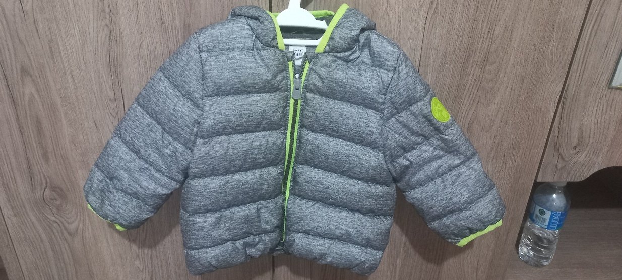 Bu erkek çocuk montu, Gap marka, gri renk, fermuar,kapişon ve kol bilek kısmında açık yeşil şeritleri vardır görselde görüldüğü gibi.