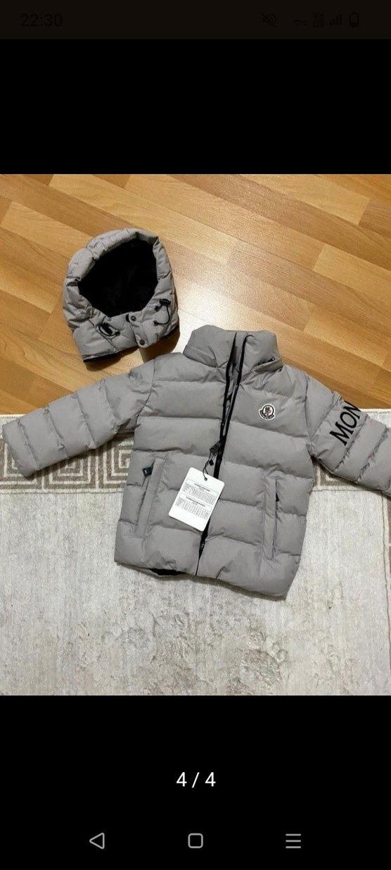 Gri renkli, düğmeli ve yakalı erkek çocuk montu. Baskılı desene ve çıkarılabilir kapüşona sahip, yumuşak ve sıcak kumaştan üretilmiştir.