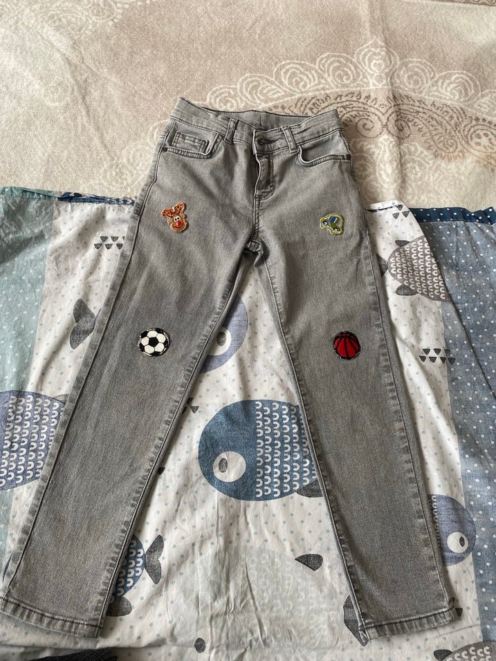 Gri renkte, düğmeli ve renkli nakış detaylı salaş kesim erkek çocuk kot pantolonu. Rahat sokak stili için uygun.