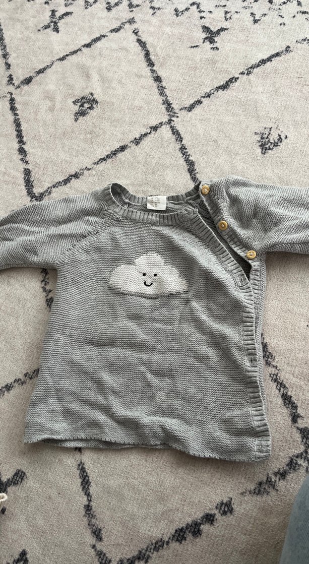 Gri renkli, nakış detaylı, uzun kollu, triko erkek çocuk kazağı. Bol kesim ve yuvarlak yaka, yan düğmeli tasarıma sahip. ☁️