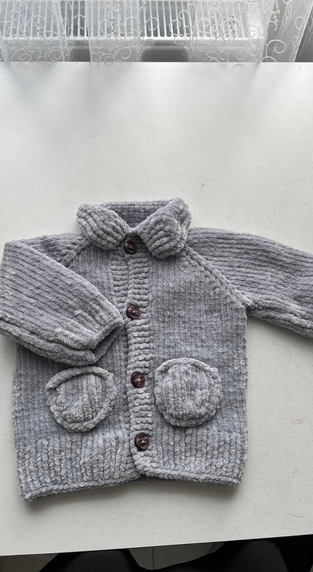 Gri renkli, düğmeli, uzun kollu erkek çocuk örgü hırka. Rahat kalıp ve klasik yaka ile iki ön cep bulunur. El örgüsü