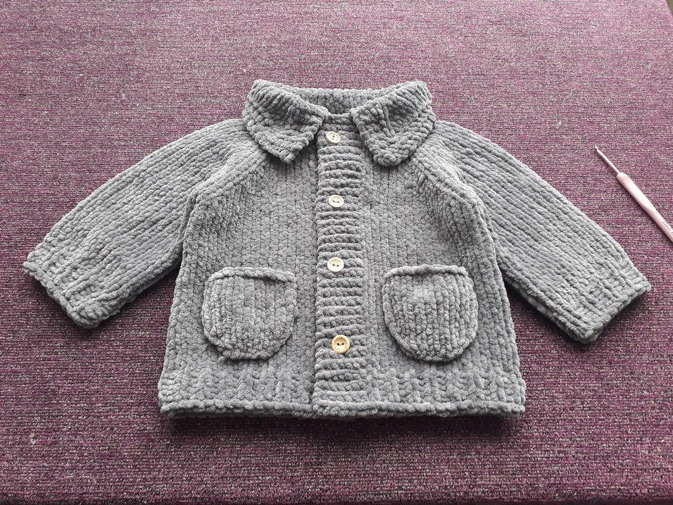 Gri renkte, uzun kollu ve bol kesim örgü erkek çocuk hırkası. Düğmeli kapama ve ön cepler bulunur. kadife ipten örülmüştür. en 29 cm, boy 33 cm