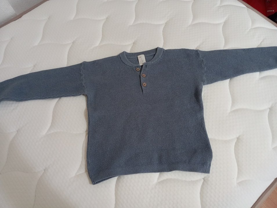 Uzun kollu, yuvarlak yaka ve düğmeli detaylı, bol kesim gri örgü erkek çocuk kazak. Yumuşak dokusu ve sade deseniyle rahat bir seçenek.