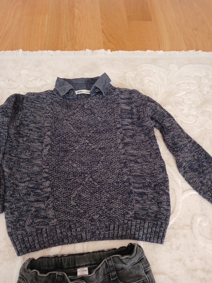 Gri renkli, örgü kumaştan üretilmiş, yuvarlak yakalı ve uzun kollu, bol kesim erkek çocuk kazak.