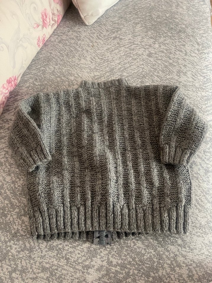 Gri renkli, örgü kumaştan yapılmış, uzun kollu, bol kesim erkek çocuk kazak. Desensiz, sade normcore tarzda.