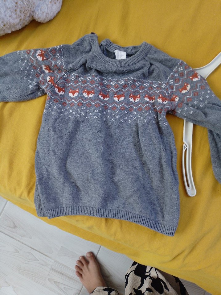 Gri renkli erkek çocuk örgü kazak, rahat kesim ve uzun kolludur. Önünde küçük tilki desenleri bulunur. 2/3 yaş uygun