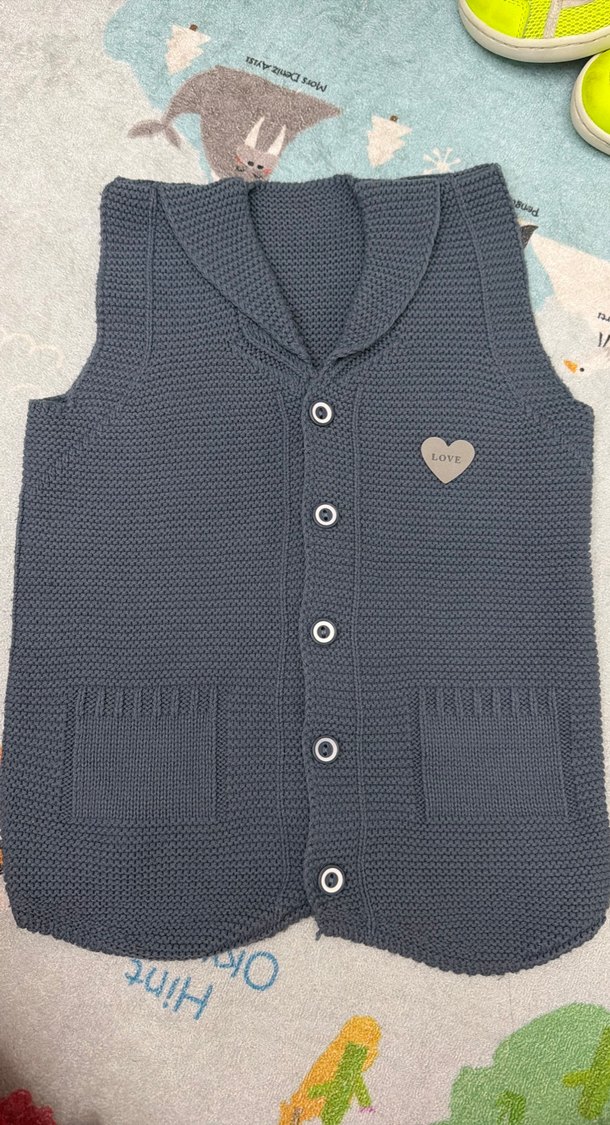Gri renkli, kolsuz ve örgü dokulu erkek çocuk hırkası, sade desensiz, ön cepli ve kalp detaylıdır.