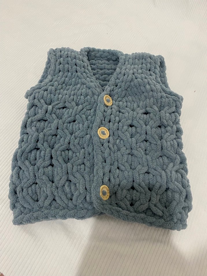 Gri renkte, bohem tarzda, örgü dokulu, düğmeli ve boğazlı, erkek çocuk için dar kesim süveter.
