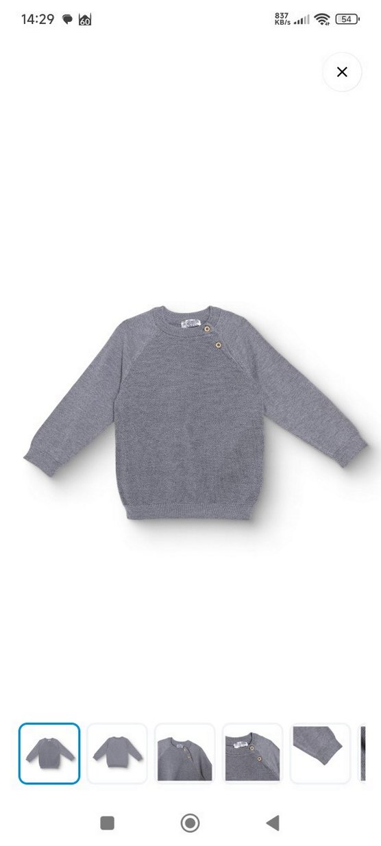 Gri renkli, örgü kumaştan yapılmış, yuvarlak yakalı ve uzun kollu erkek çocuk sweatshirt. Omuzda düğme detayları bulunur.