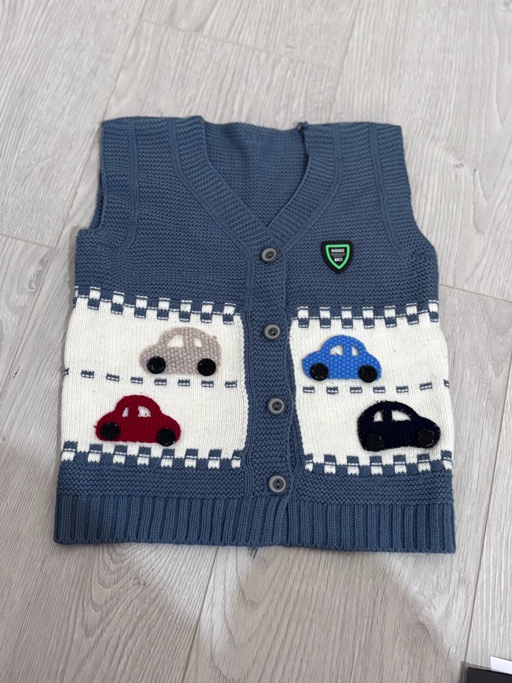 Gri ve beyaz tonlarda nakışlı araba desenli, örgü kumaştan yapılmış, sokak stiline uygun, fitted kesim kolsuz yelek.