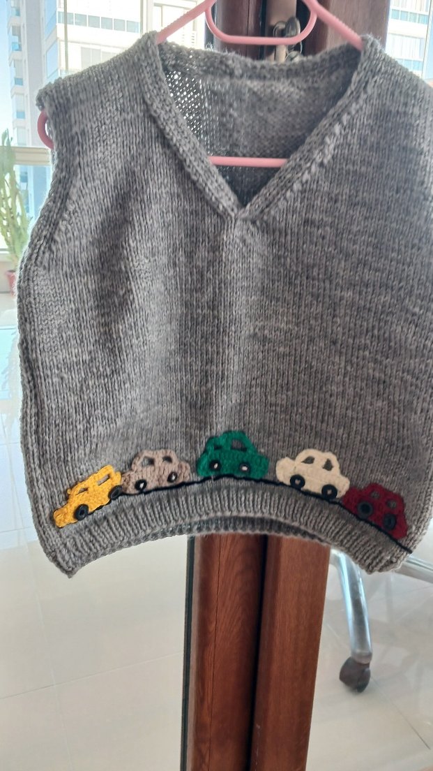 Gri renkli, kolsuz örme süveter, bol kesim ve alt kısmında renkli arabalar nakışı ile 3 ve 4 yaş tarzına uygun. örmüş olduğum süveter numunedir yaş gurubuna göre siparişle örmrkteyim.