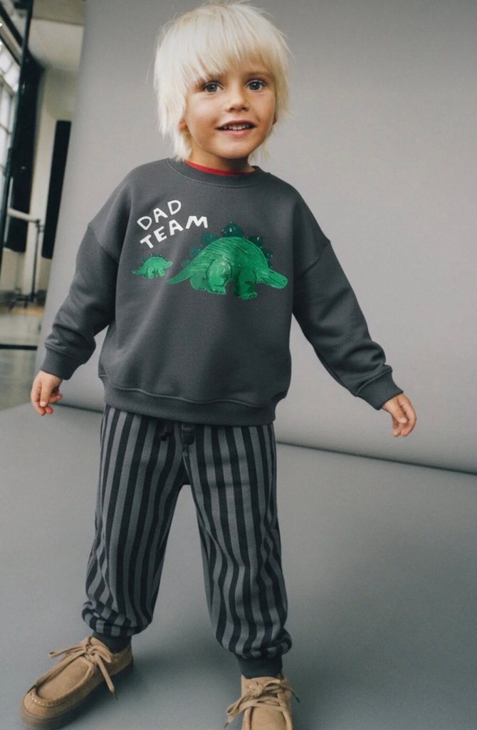 Oversize kesim gri erkek çocuk sweatshirt ve çizgili eşofman altı takımı. Sweatshirt üzerinde dinozor baskısı ve örme detaylar bulunur.