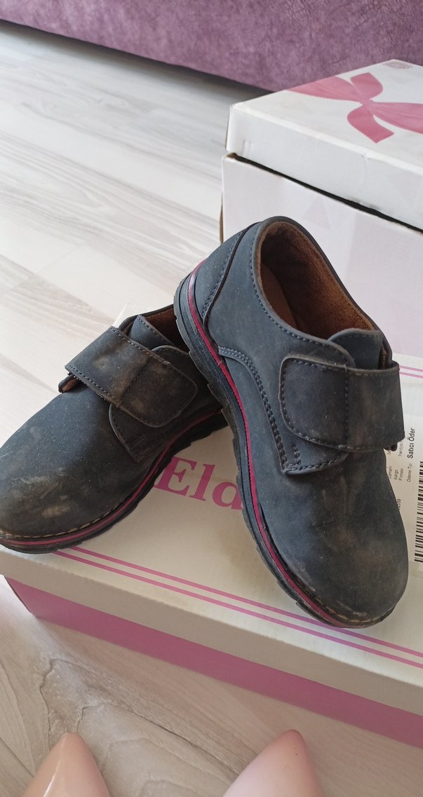 Gri renkte, tokalı ve kauçuk tabanlı erkek çocuk özel gün ayakkabısı. Sade ve desen içermeyen normcore tarzı. birkez düğünde giydirdim üzerindekiler toz silince geçer hediyeli gondericrm