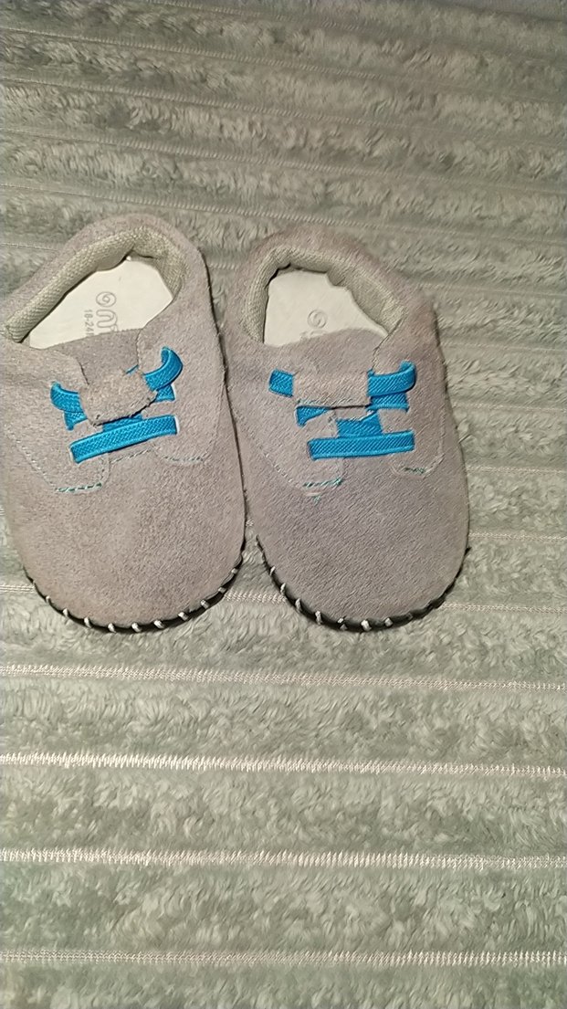 Gri renkli, erkek çocuklar için yumuşak ve sıcak peluş kumaştan, kürk detaylı, mavi nakışlı ev terliği.