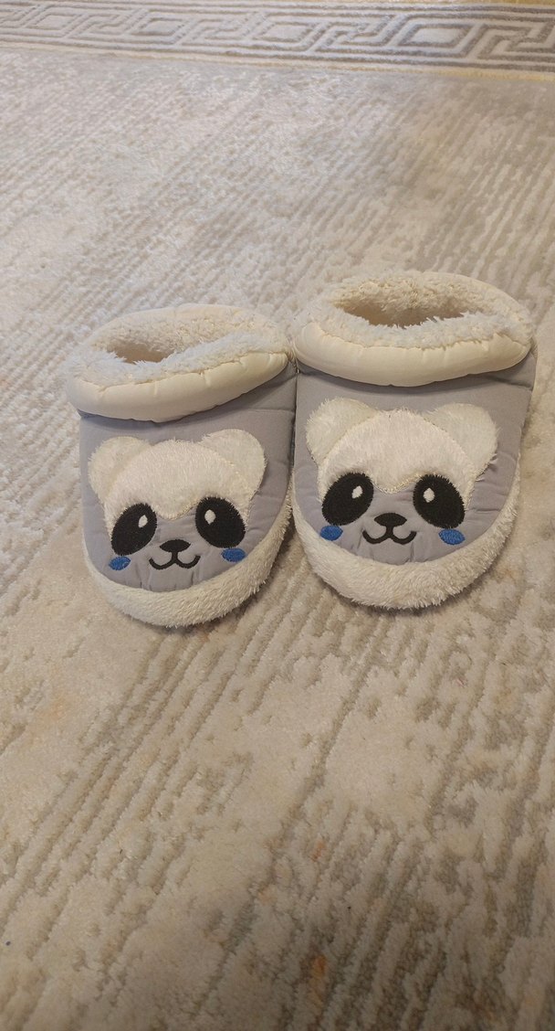 Gri renkli, yumuşak ve sıcak kumaştan yapılmış, peluş detaylı ve nakışlı panda desenli erkek çocuk ev terliği.