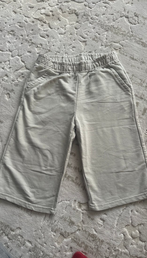 Gri/bej renkli erkek çocuk şortu, bol kesim ve yumuşak penye kumaştan üretilmiştir. Elastik bel bandı ve sade deseni ile rahat bir kullanım sunar. Sağ arka bacağının yanında minik bir hasar var, fotoğrafta gösterildi. Basit bir dikişle kapanabilir.