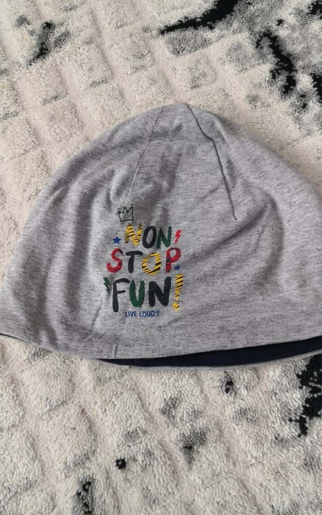 Gri renkli, yumuşak polar kumaştan yapılmış erkek çocuk bere. Üzerinde renkli baskılı 'STEP, FUN., LIVELOUD' yazıları ve ayarlanabilir cırt cırt detay bulunur.