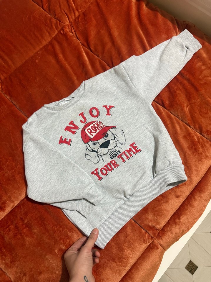 Gri renkli, uzun kollu ve yuvarlak yakalı erkek çocuk sweatshirtü. Baskılı köpek figürü ve kürk detayları içerir. Rahat kesim ve yumuşak polar kumaş.
