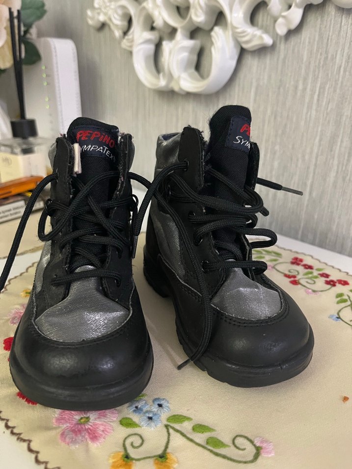 Gri renkli, lastik malzemeden yapılmış, velcro kapamalı punk ve gotik tarzı erkek çocuk botları. Düz tasarıma ve bağcık detayına sahiptir.