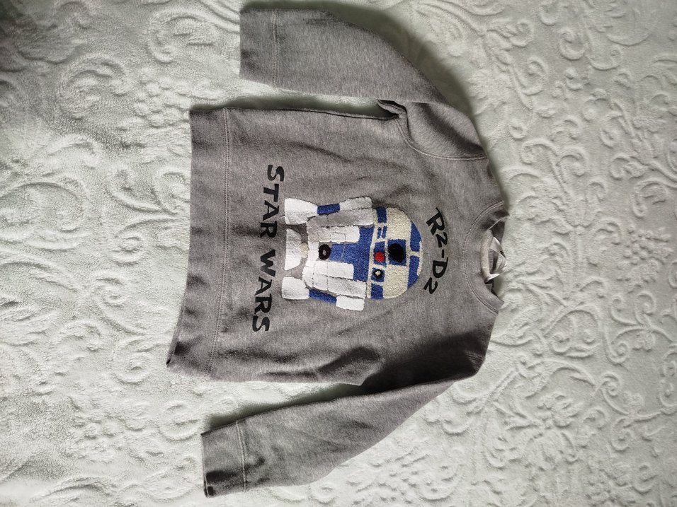 Gri renkte, uzun kollu ve yuvarlak yakalı erkek çocuk sweatshirtü. Yumuşak ve sıcak kumaştan yapılmış, örme dokulu ve Star Wars R2-D2 baskılıdır.