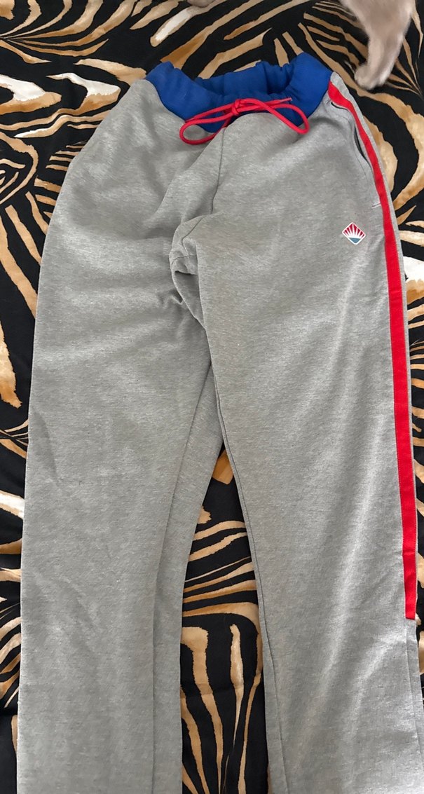 Gri renkli, rahat kesim erkek çocuk eşofman altı, yumuşak ve sıcak kumaş, fermuarlı cepler ve kırmızı yan şeritlere sahip.