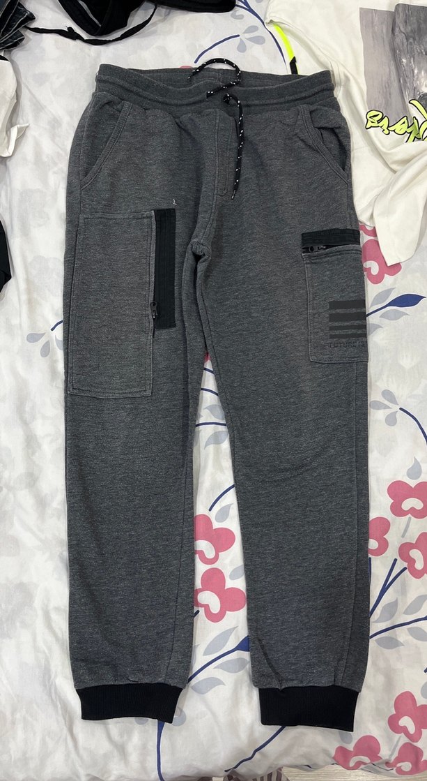 Gri renkli, rahat kesim erkek çocuk eşofman altı, sentetik kumaştan, fermuarlı ceplere sahip, sokak stiline uygun.