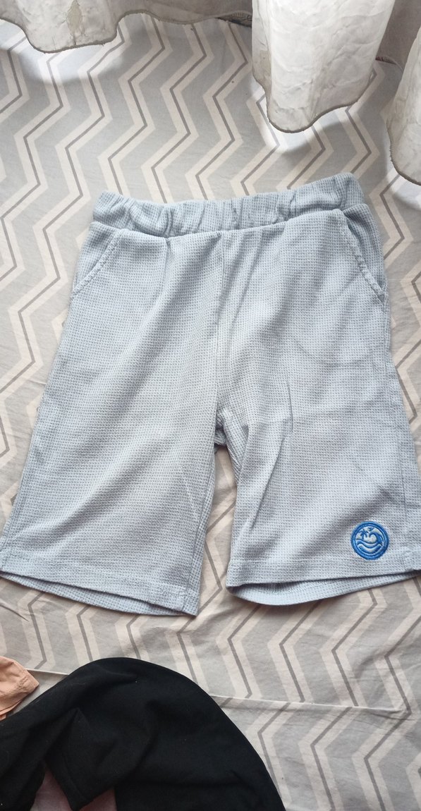 Gri renkli, rahat kesim erkek çocuk şortları yumuşak dokulu kumaştan üretilmiştir. Yan cepleri ve küçük gülen yüz detaylı bir rozeti vardır. Rahat sokak stili için uygundur.