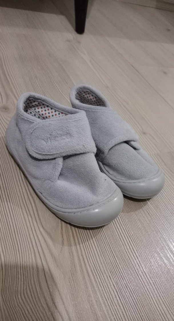 Gri erkek çocuk terliği, yumuşak kumaş ve kolay giyilmesi için cırt cırtlı kapama ile. Rahat ve sade tasarım, dayanıklı tabanlı.