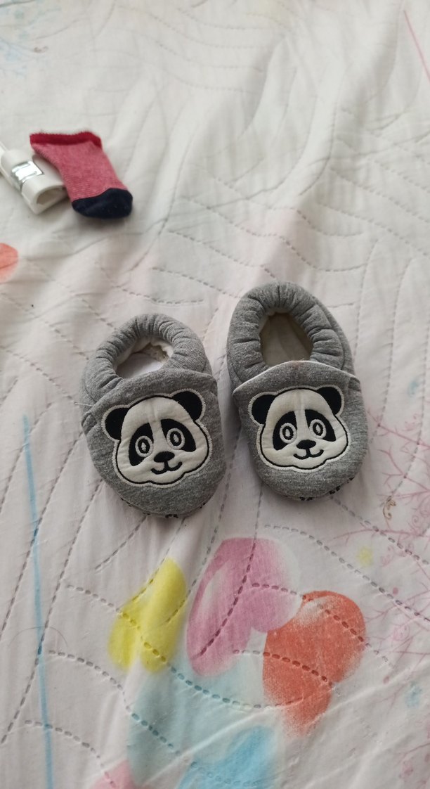 Gri renkli, içi kürklü ve nakışlı panda desenli erkek çocuk ev terliği, rahat ve sıcak tutar.