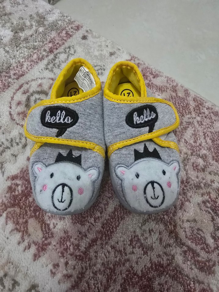 Yumuşak kumaş hissi veren gri çocuk panduf, cırt cırtlı kapanış ve sevimli ayı desenli. Kayışlarda 'hello' ve 'hells' yazılı. 21 numaradır temiz