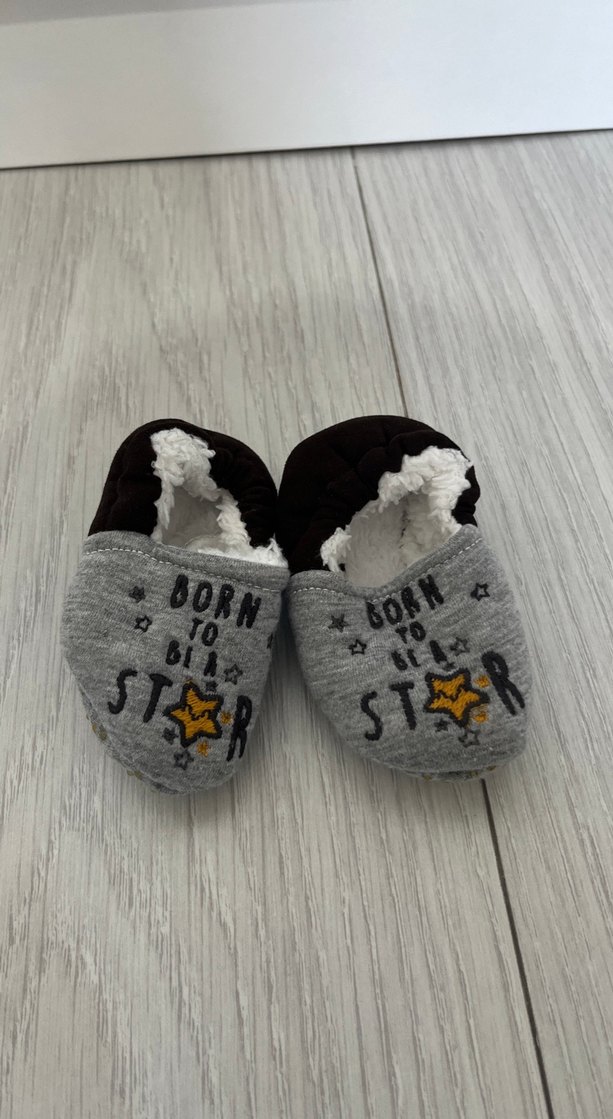 Yumuşak iç doku ve nakışlı yıldız desenli gri erkek çocuk sıcak terlik. Kolay kullanım için cırt cırtlı kapama. Rahat ve sıcak tutar. ⭐ yenidoğan içindir 0-3 ay kullanım yazıyor