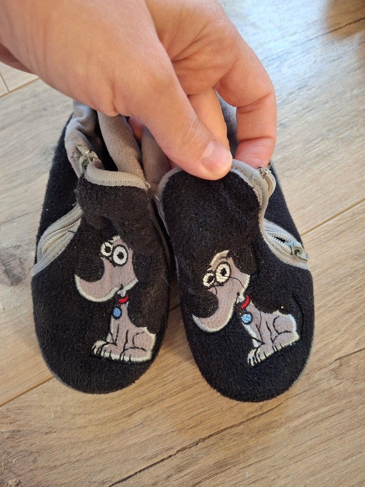 Gri renkli, nakışlı köpek desenli, Velcro bantlı, yumuşak ve sıcak kumaştan yapılmış erkek çocuk terlikleri.