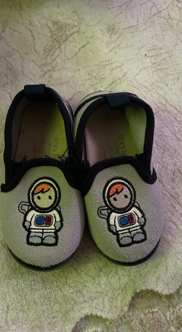Gri renkli, astronot nakışlı erkek çocuk sıcak terlikleri, Velcro kapama ve kauçuk taban ile rahat kullanım sağlar.