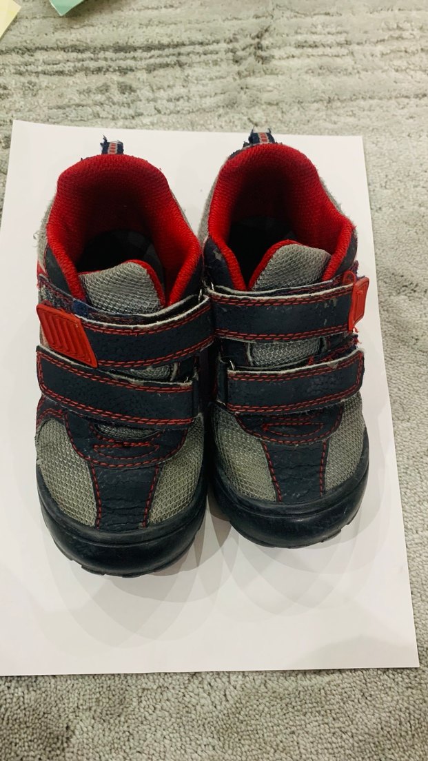 Gri renkli, ve velcro bantlı erkek çocuk spor ayakkabısı. Rahat ve günlük kullanıma uygun.