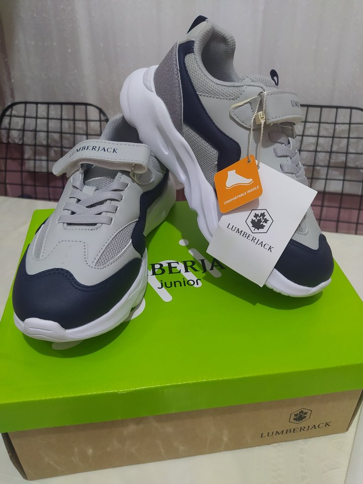 Gri renkli, baskılı desenli erkek çocuk spor ayakkabısı. Velcro bantlı ve dayanıklı kauçuk tabanlı, Lumberjack markalı. FLO mağazasından alındı .Fatura sı kayboldu okul için aldım .2 ayda ayağı büyümüş ayağını sıktı sıfır