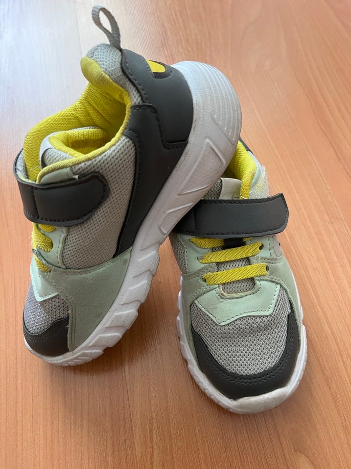 Gri renkli, kauçuk tabanlı ve velcro bantlı erkek çocuk spor ayakkabısı, trend sokak stili için uygundur. Rahat ve sade tasarımlıdır. Işıklı, herhangi bir yırtık veya deforme yoktur.