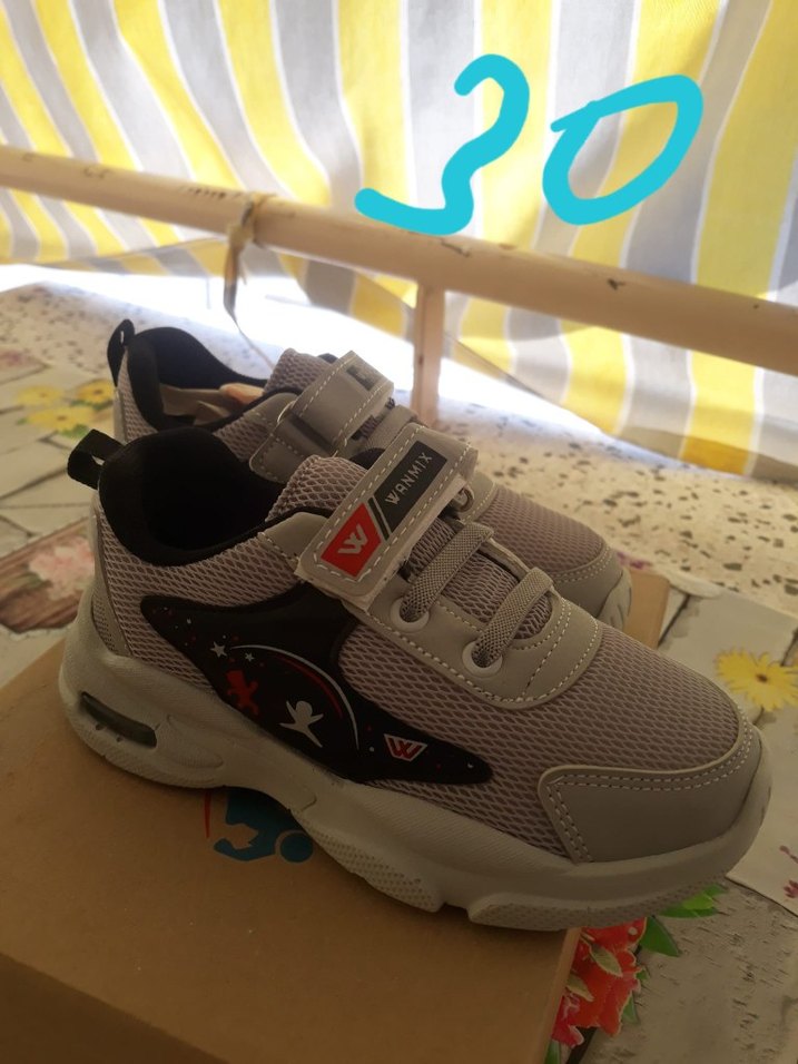 Gri renkli, baskılı detaylara sahip erkek çocuk spor ayakkabısı. Kauçuk taban ve kolay kullanım için velcro bantlıdır.