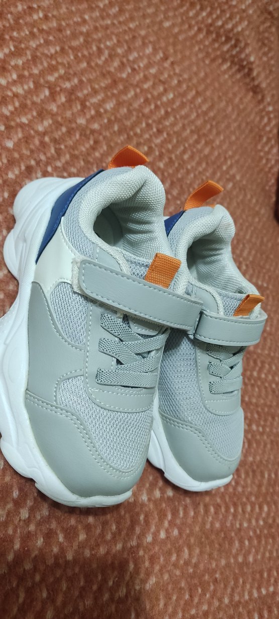 Gri renkli, velcro bantlı, kauçuk tabanlı erkek çocuk spor ayakkabısı. Rahat ve şık sokak stili için uygundur.